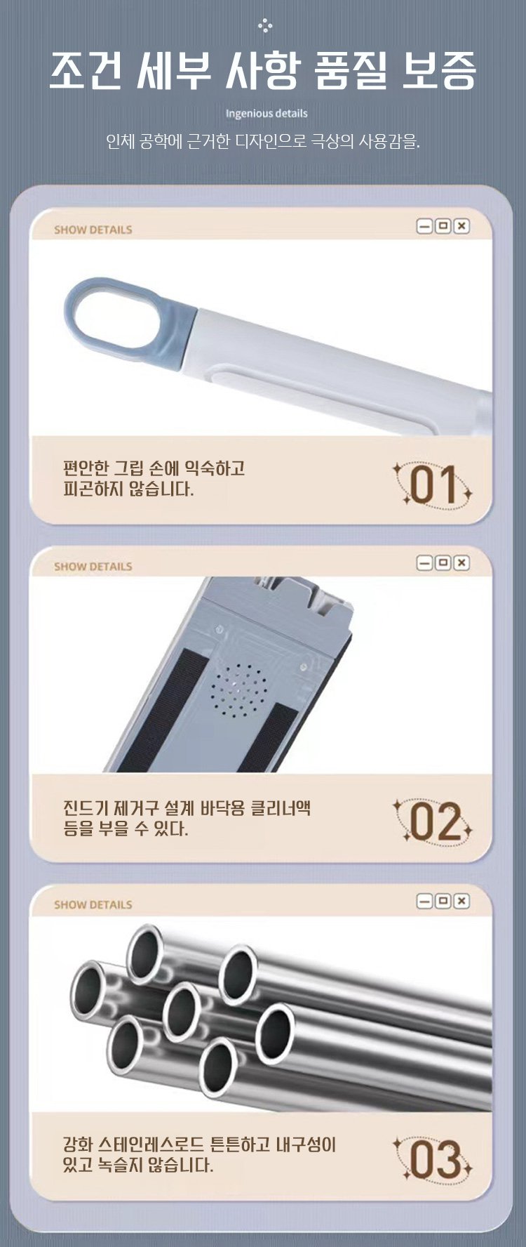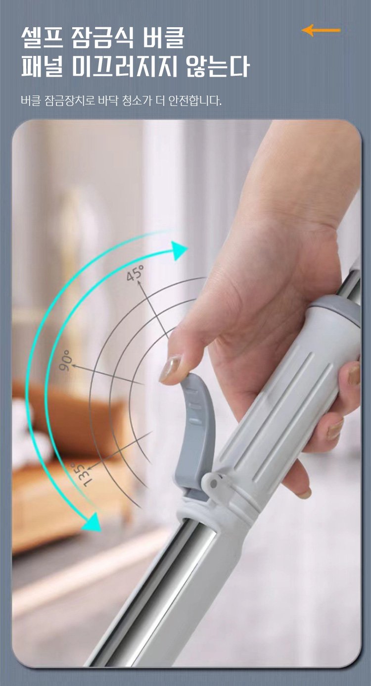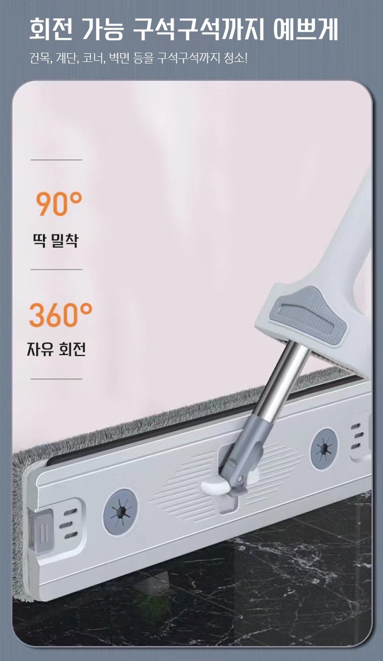 360도 회전 걸레 헤드로 청소 시 사각지대가 없습니다. 인체공학적 디자인으로 허리에 무리가 가지 않습니다.